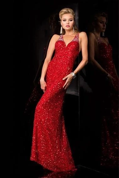 Beautiful, fully sequined gown with a V-cut neckline and shoulder straps leading to a racerback style back.