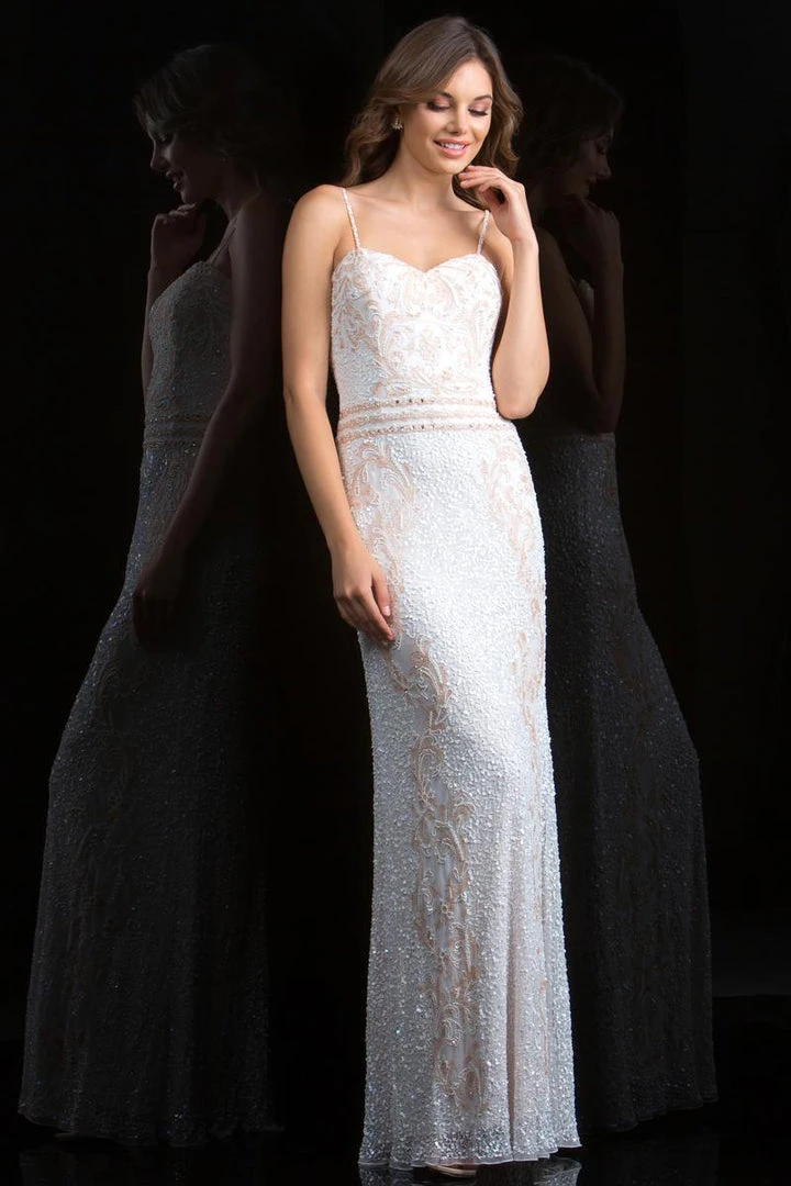 Muster up the courage to glow with the iridescence of the celebrities in this Scala 48835 creation. Twinkling with ivory sequins contrasting with pastel-detailed scroll motif, this glamorous piece shows off a sweetheart neckline paired with a mid-open back and supporting ornate spaghetti straps. Showcasing tri-bands along the natural waist rendered in beads, the sheath skirt skims along the hips before streaming down the floor with its full-length hemline. Be that fascinating stunner that wows the crowd in this chic Scala masterpiece.