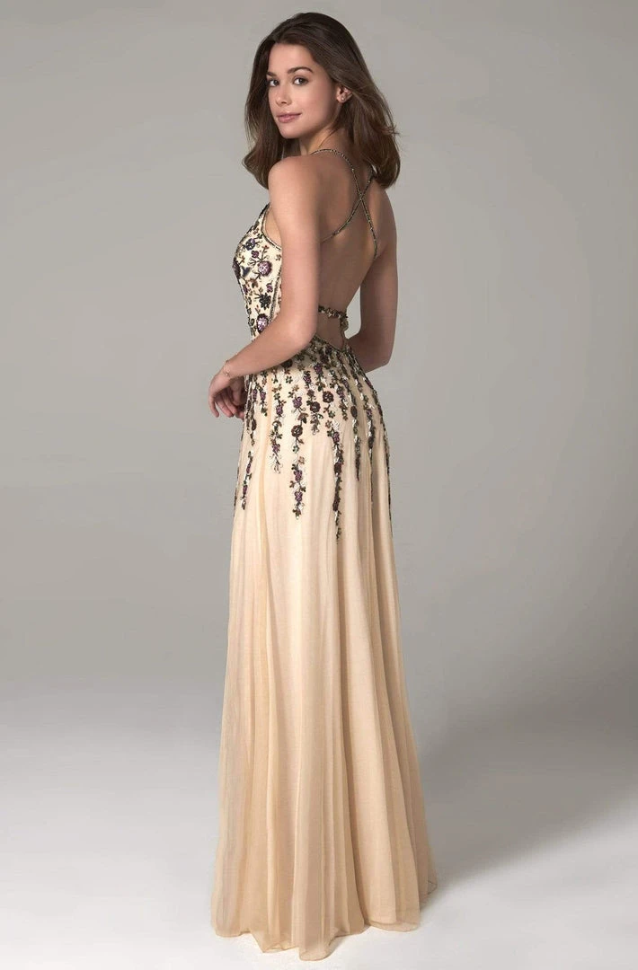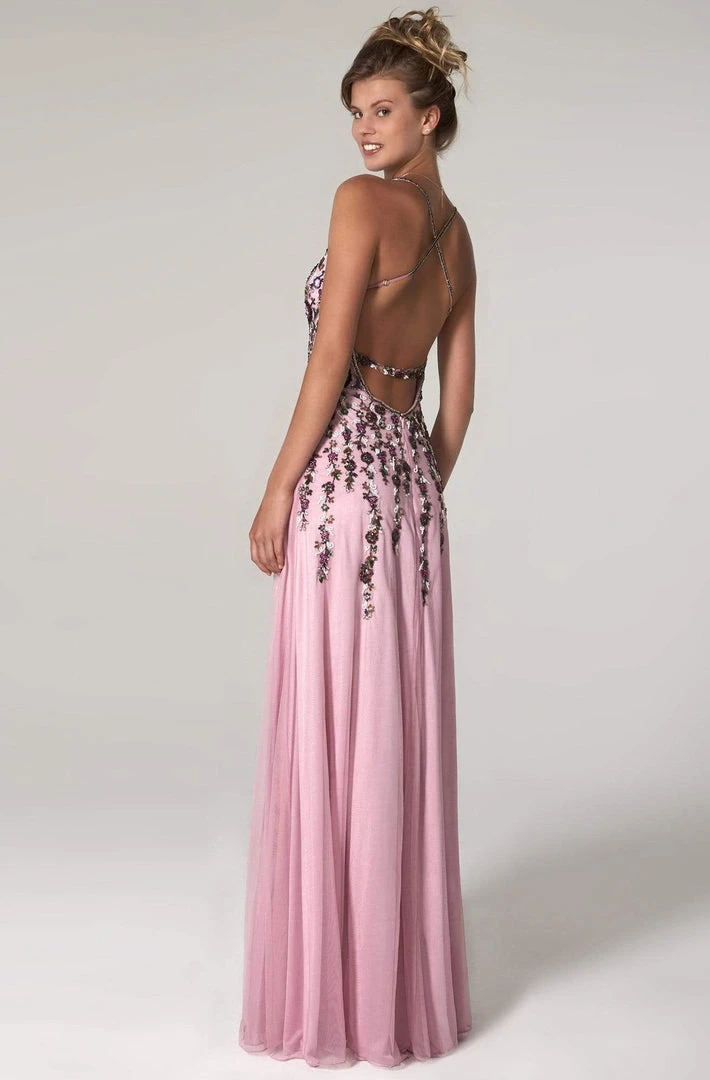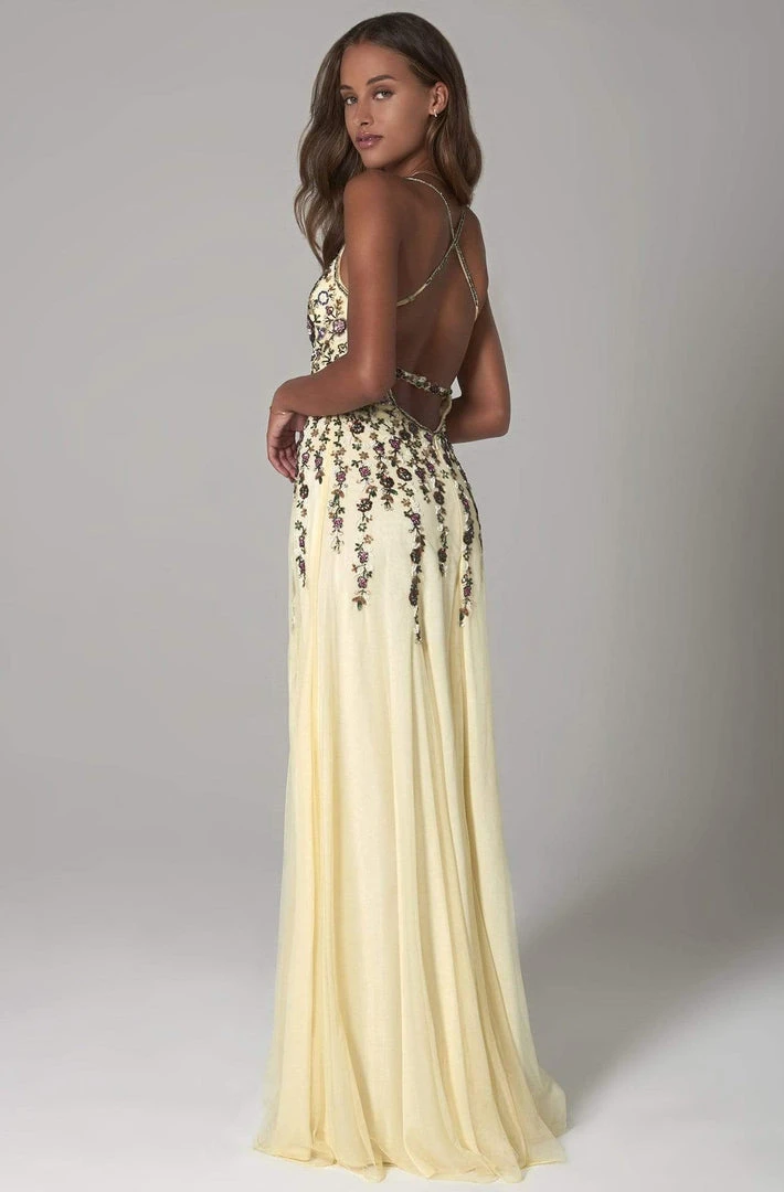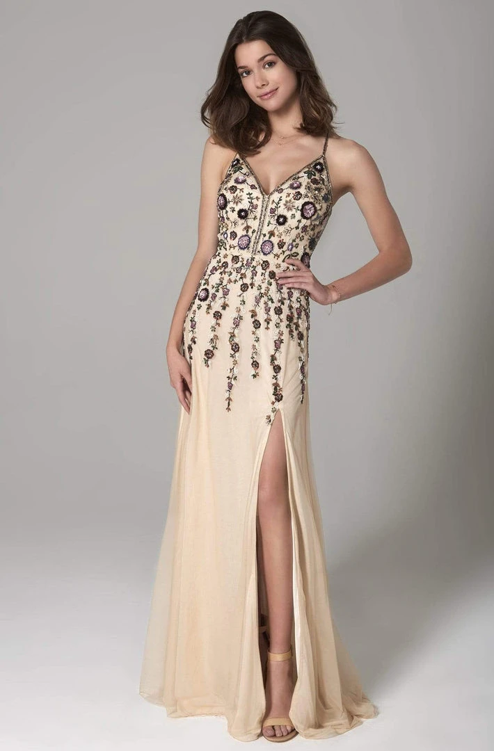| Details: | Spaghetti strap, Plunging neckline, Fitted bodice, Embellished, Long column dress, Thigh high slit, Open strappy back, Back zipper |