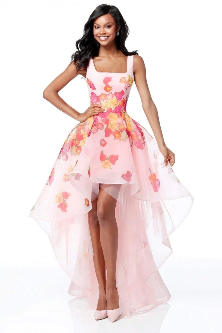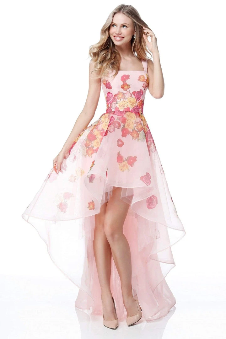 Dress to impress with this design by Sherri Hill 51684. This floral organza dress fashions a sleeveless, square neckline with wide straps. The fitted bodice has a low scoop back and from the waist flourishes a high low A-line skirt. Be the spotlight wearing this extravagant Sherri Hill dress.
