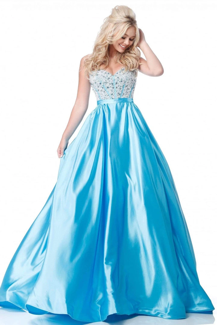 | Details: | Strapless, Plunging neckline, Beading, Corset, Satin, Ballgown skirt |