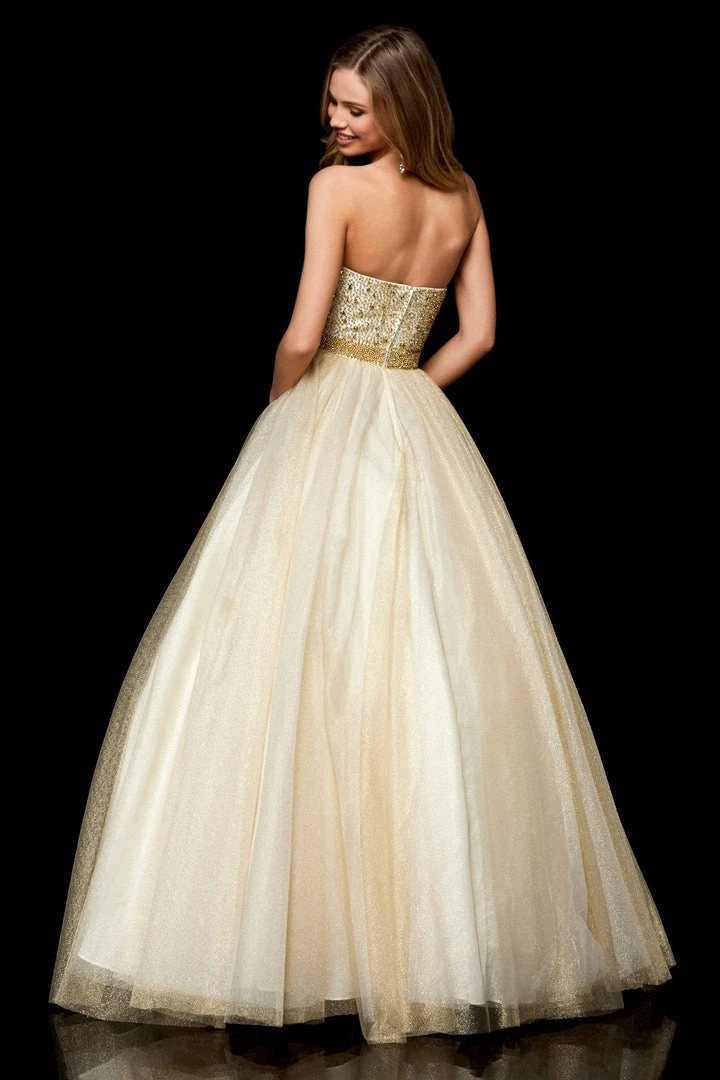 Bring that chic style to the prom wearing Sherri Hill 52264 evening gown. A fit-and-flare dress that has a fitted, strapless, breaded bodice with thin band around the waist. A soft tulle skirt that features A-line silhouette flows freely and smoothly to the floor. Get the party started in this spectacular evening dress from Sherri Hill. Model is wearing Gold color.