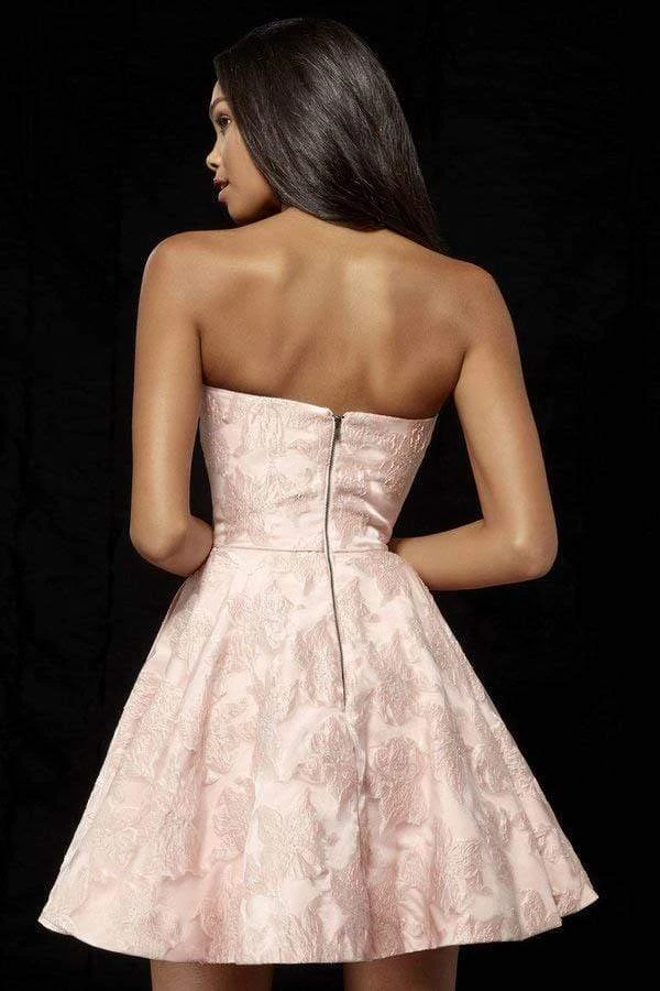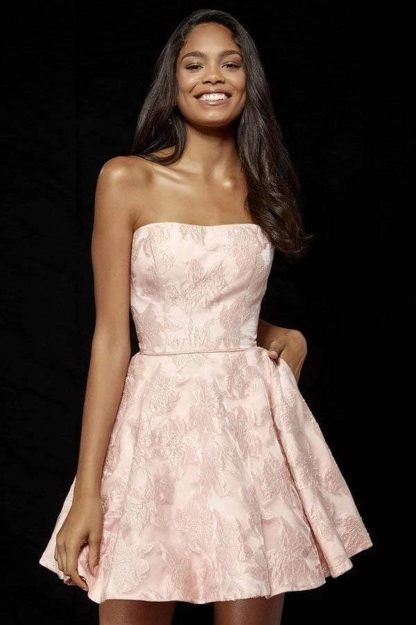 Get that glamorous casual feel in this stunning Sherri Hill 52337 cocktail dress. Beautifully made in brocade print, this stellar piece features a princess seamed strapless bodice with a semi-sweetheart neckline and mid-open back. Adorned with soft pleats and side pockets, the a-line skirt flares gorgeously to the mid-thigh length hemline. This Sherri Hill homecoming dress is a romantic choice for your dance.