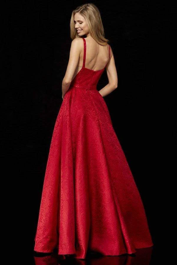 Go for a timeless and sophisticated look wearing this prominent design by Sherri Hill 52349. This long brocade gown glams in a sleeveless, scoop neckline with fitted bodice styled with a plunging sheer panel. The dress has a mid-open back and the waist is wrapped in a thin band. The skirt flows towards the floor in a defined A-line silhouette. This Sherri Hill look is your excellent choice for prom or for any special occasion when you dare to look extraordinarily fabulous! Model is wearing Red color.
