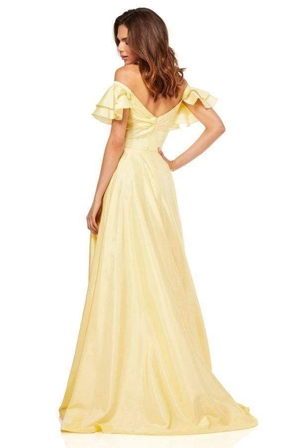 Be simply gorgeous in this exemplary masterpiece by Sherri Hill 52469. Beautifully made in Taffeta fabric, this stunner features a ruched bust with a sweetheart notched bodice and a shallow V-back, framed with an off-shoulder ruffle sleeves. This dress has a set-in midriff that gives way to the high slit a-line skirt, dramatically finished with a court train. Beam with pride when you wear this spectacular Sherri Hill creation.