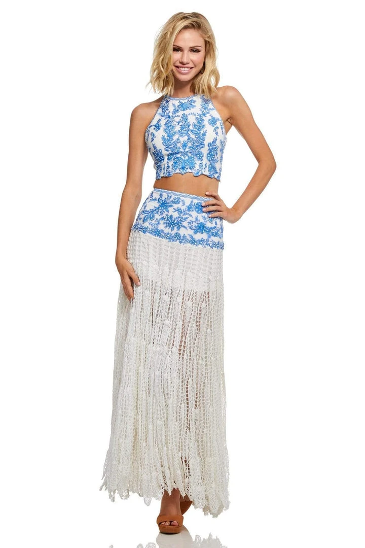 Exude a charm that is meant to mesmerize the elite crowd in this gorgeously decadent dress by Sherri Hill 52671. This two piece dress showcases a sleeveless, halter neckline crop top with top styled with lace embroidery. It has a lace up closure while the hand crochet skirt is styled in a full length A-line silhouette. Paint a picture of pure grace as you channel your inner celebrity style with Sherri Hill.