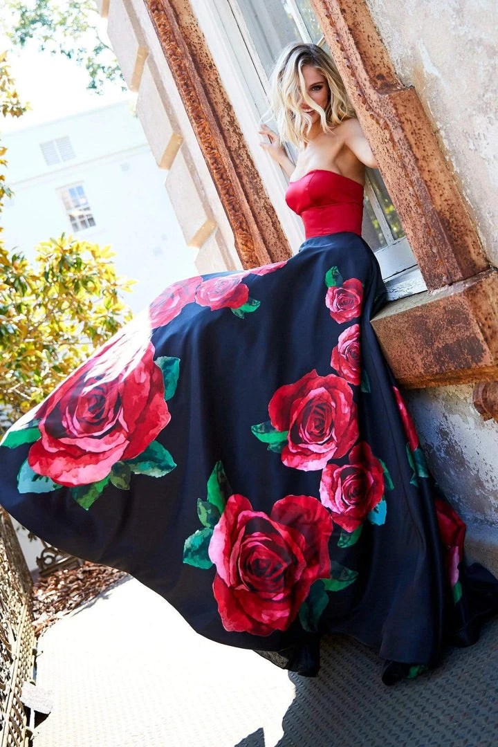 Light up the night in this eye-catching dress by Sherri Hill 52738. Glams in a strapless, satin straight across neckline with a lace up back. The floral print flourishes a full length A-line skirt with a sweep train finish. Have fun in this fashionable Sherri Hill dress.