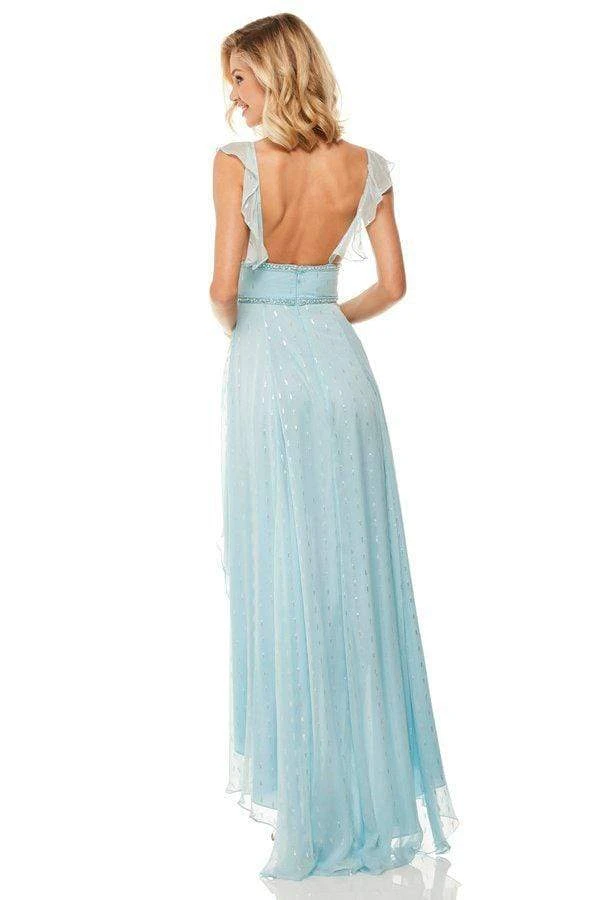 Be the darling of the crowd as you appear in this ultra-chic piece by Sherri Hill 52799. Made in a chiffon fabric, this stunner features a ruffled V neckline and cap sleeves, as the back flaunts an open cut secured with a center zipper closure detail. Metallic bands encircle the waistline and empire line of this dress as it reveals an a-line skirt that cascades to a high low hemline. Showcase your beautiful side in this Sherri Hill creation. Model is wearing Light Blue color.