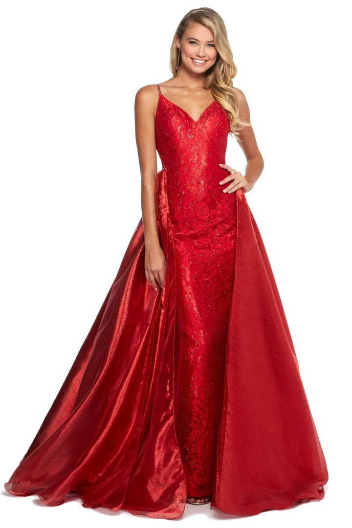 You are more than gorgeous when you wear this unbeatable gown from Sherri Hill 52975. Designed with beautiful beaded lace and organza, this long dress glams a sleeveless, V-neckline with spaghetti straps. The dress flaunts an open back and from the waist flourishes a full length sheath skirt with an overskirt with a sweep train finish. This Sherri Hill dress will let you celebrate that divine feminine beauty!