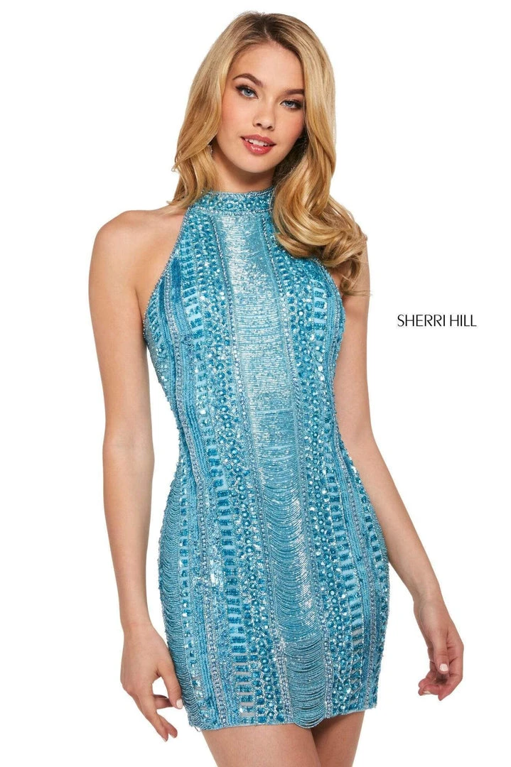 Holographic shimmer ensconces you in light when you wear this glamorous dress by Sherri Hill 53092. This dress is embellished throughout with sequins and beads and features halter neckline, sleeveless and a short sheath dress. To add glamour and sexiness of this dress, a keyhole back design is there to complete the look. Dive into a divine event in this luxe creation of Sherri Hill.
