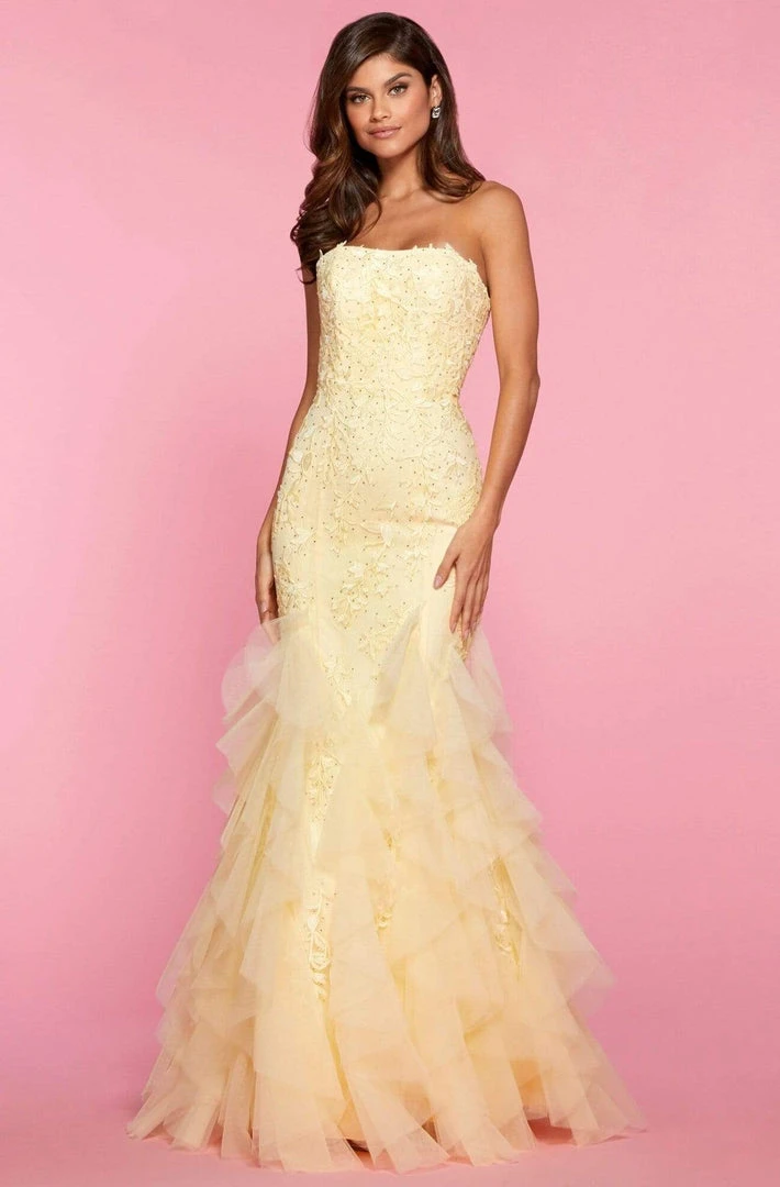 Make them swoon as you saunter by in this gorgeous Sherri Hill 53346 creation. Embellished with trailing foliage lace and a sprinkling of rhinestones, this gown shows a strapless straight-across neckline with a mid-open back. The mermaid skirt is accented with layered godets as it trailing down the floor with a train. Impress everyone with the immaculate flair of this Sherri Hill masterpiece. Models are wearing the Ivory, Light Blue and Yellow colors.