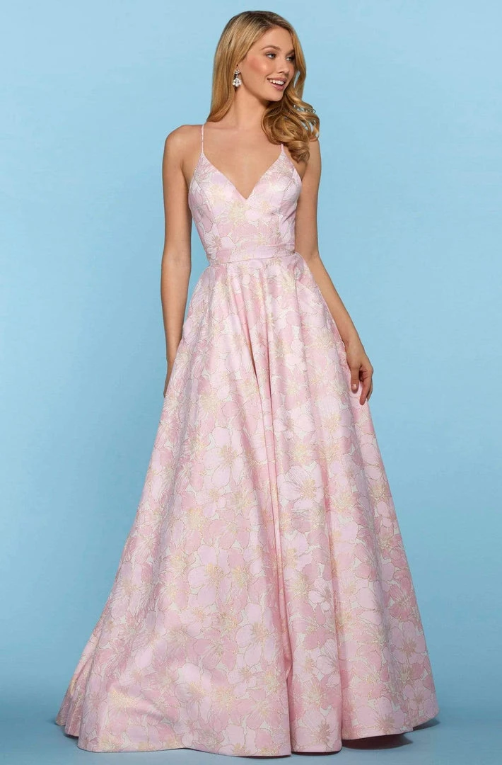 Enter the hall with grace and beauty in Sherri Hill 53397. This brocade dress features a sleeveless, plunging V-neckline with spaghetti straps connecting to the strappy back. It has a fitted bodice and from the waist flourishes a full length A-line skirt and finishes in a sweep train. This Sherri Hill dress is a brilliant pick for any special party.