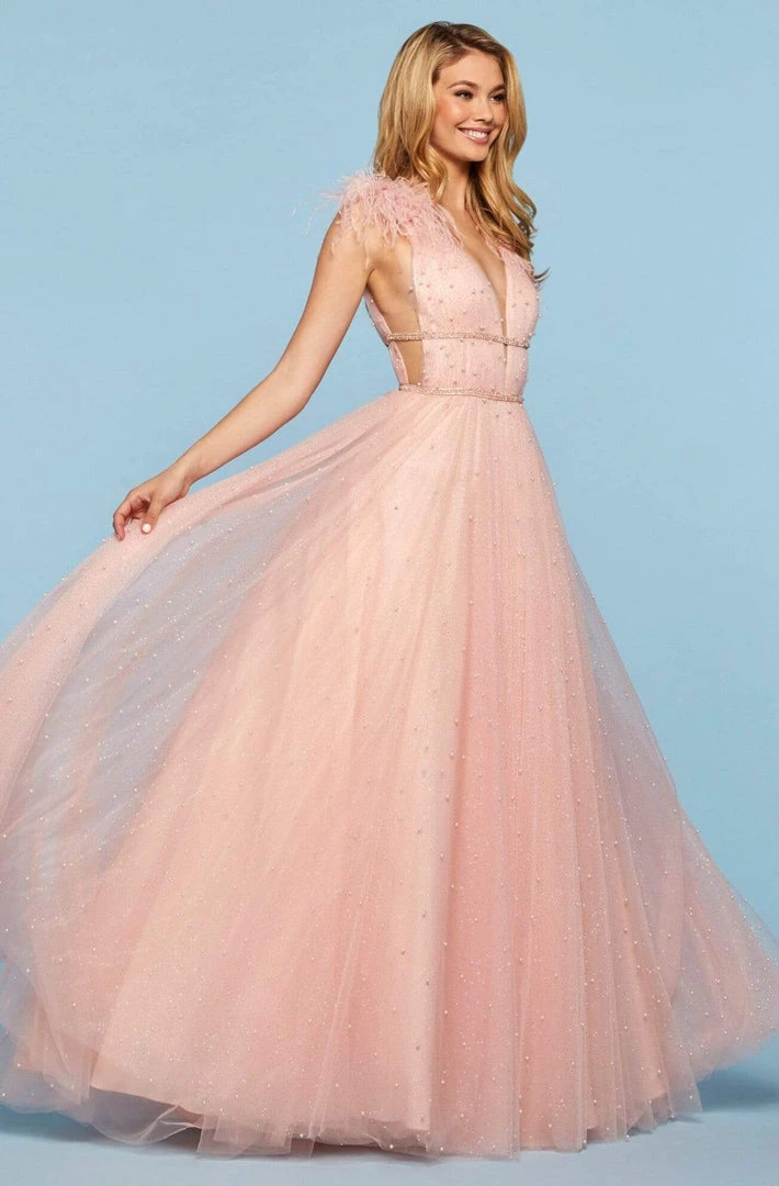 Surround yourself with decadence in a dazzling Sherri Hill 53413. Tailored with a plunging V-neckline with mesh, this sleeveless stunner features feather details on the shoulder, adorned with pearl and glitter accent, beaded waistband, sheer side insets, open V-back and a zipper closure. The A-line silhouette skirt features a sweep train. Look impeccably polished as you sweep them of their feet in this dazzling Sherri Hill masterpiece. Model is wearing pink.
