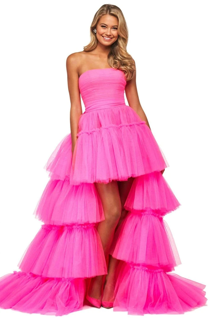 Walk in seduction and style in Sherri Hill 53776. Tailored with straight-across neckline and ruched bodice, this masterpiece features a mid-open back and lace-up detailing and a tulle ribbon. The skirt is tailored with high-low tiered ballgown and a sweep train. What an outstanding choice for prom, easy to dance in and you get to look like a princess. Model is wearing pink. Find more evening dresses!