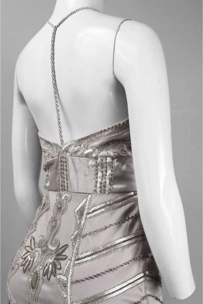 Captivate the crowd as you walk in this sleeveless bodice that features slim straps that frame the V-neckline and a T-shaped back. This slim-fitting dress features sparkling rows of delicate sequins and beading in an art deco pattern for a glamorous old Hollywood look. A smooth short sheath skirt completes the look of this sophisticated creation.
