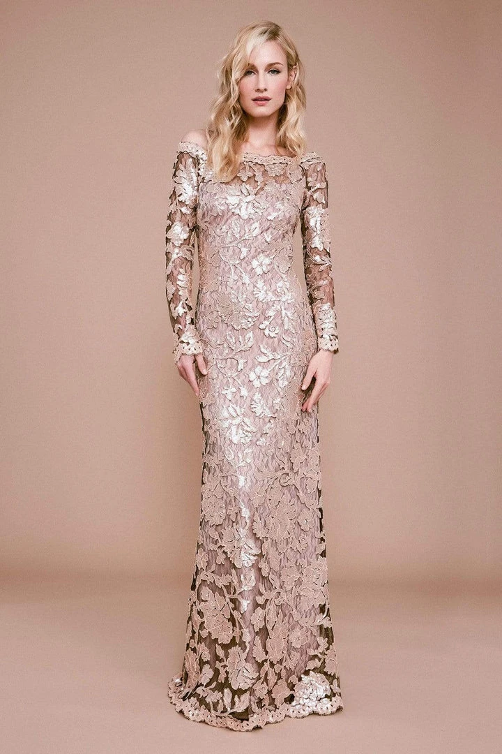 Stunningly designed in matte-metallic paillette embellishments, this dress features a fitted bodice framed with an off-shoulder neckline over a distinct sweetheart lining and long sleeves. This dress presents a sheath silhouette that cascades to a full length hemline, finished with scalloped edges and eyelash trims as the mid-open back is secured with a center zipper closure.