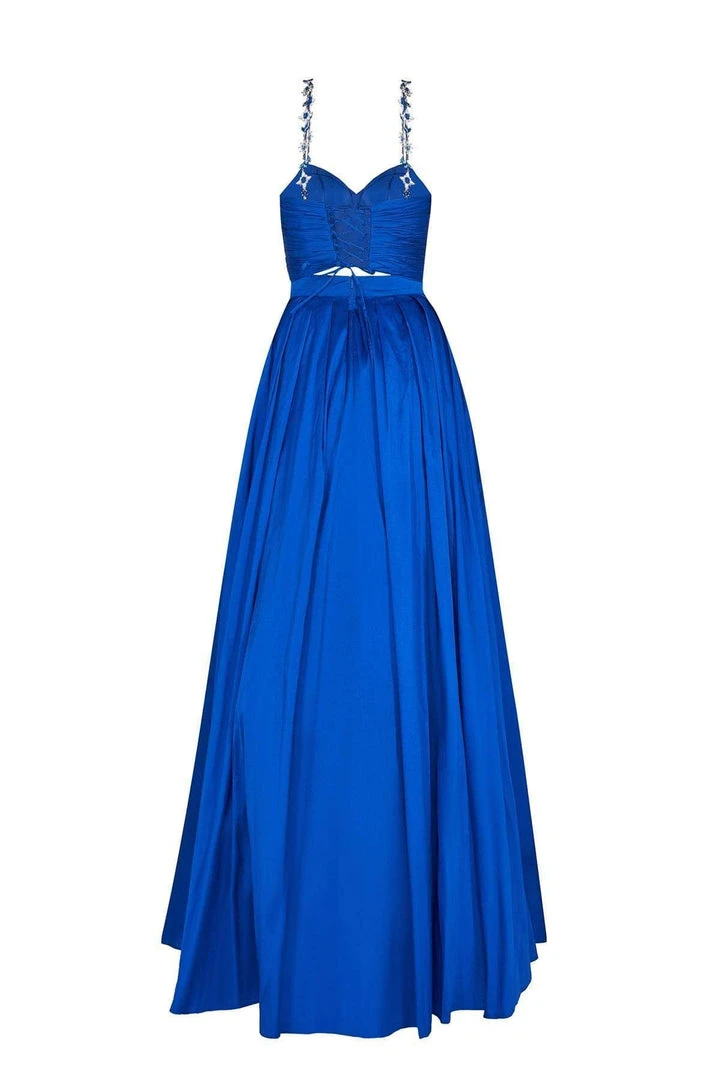 | Details: | Taffeta, Two-Piece, Jeweled Spaghetti Straps, Shirred Bodice, Lace Up Back, Back Zipper Closure, Slender Waistband, Brooch Ornate High Slit, Pleated Skirt, Sweep Train |