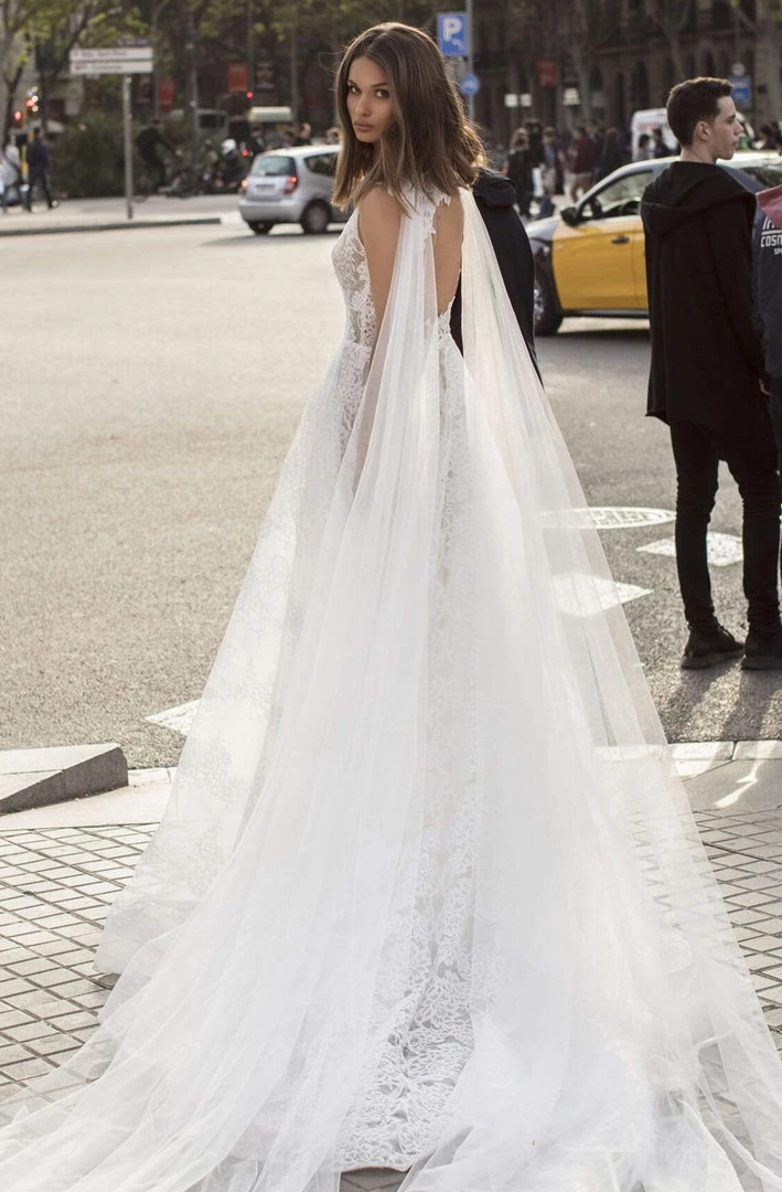 | Details: | Tulle, Plunging V-Neckline, Lace Detailing, Keyhole Back, Semi-Cape Accessory, A-Line Silhouette, Court Train |