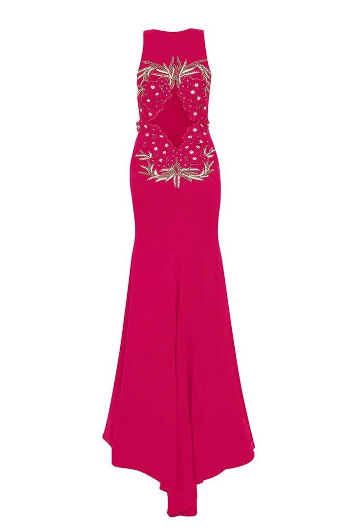 Grace your party with exquisite confidence and beauty in this sculpted Tarik Ediz 92561 creation. Sculpted by seams on a lycra crepe fabric, this gorgeous piece presents a high halter neckline and beaded floral appliques silhouetting the asymmetrical cutout on its lower back. Beautifully streaming down from the bodice to the slimming full-length hem, the sheath skirt serves the denouement with a thigh high slit and a sweep of glorious train. Show everyonesur preference for the artistically upscale in this Tarik Ediz masterpiece. Models are wearing the Oil and Fuchsia colors.
