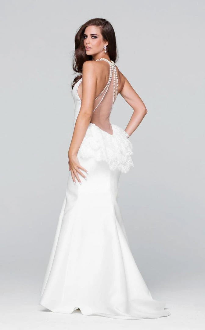 | Details: | Sleeveless, Pearl accents, Fitted bodice, Sheer fabric at the back, Ruffled lace detail, Mermaid skirt |