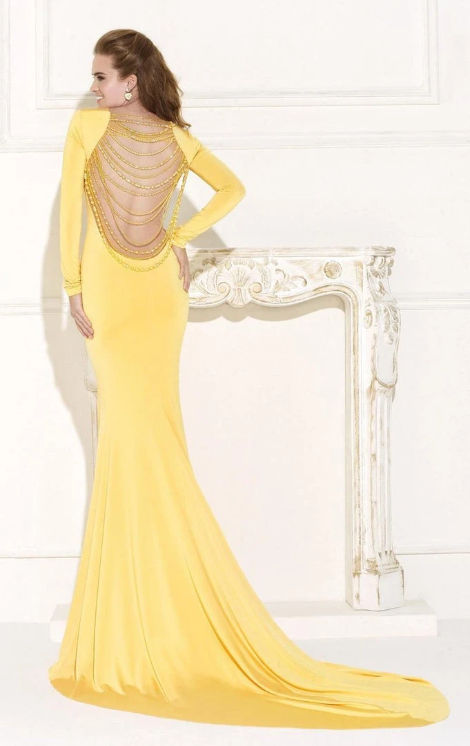 Look like an embodiment of sweet decadence in this charmingly bejeweled Tarik Ediz 92469 creation. Lavishly sculpted from top to toe, this fascinating piece displays a square neckline framed with long sleeves and a plunging scoop open back elaborated with multi-strands of iridescent draped jewels. Split with a thigh high slit, the trumpet skirt embraces every curve as it completes with a dramatic cascading court train. Dazzle in this sweet couture Tarik Ediz masterpiece.