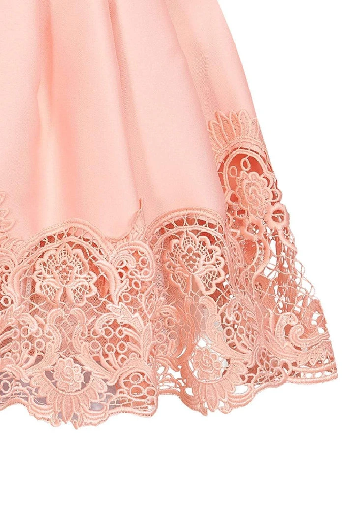 Exude a vintage appeal in this picture perfect short dress from Tarik Ediz 50048. Delicate lace insets decorate the jewel neckline while princess seams outline a faithful fit along curvy bust and midriff. A self-fabric band wraps the waist, and a matching bow offers pretty detail. Soft gathers shape the flared, short skirt while the lace-bordered hemline provides a posh finish. Keep it fun and flirty with this pretty short formal by Tarik Ediz. Model is wearing Cream color.