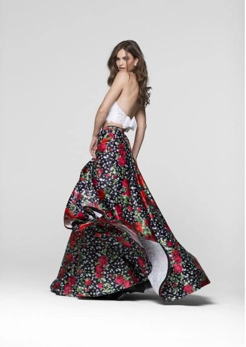 Fashion yourself glamorous in this lush two piece by Tarik Ediz 50038. Pearlescent beads form a gleaming necklace strap, and a beautiful rose supplies a fresh accent. The lace halter-style bodice boasts a sculpted fit atop a strapless lining while airy scalloped edging frames the bared midriff. A slender waistband debuts the contrasting skirt and bias-cut billows spill to a rippling full-length. Make it your moment to stand out wearing this lovely Tarik Ediz design.